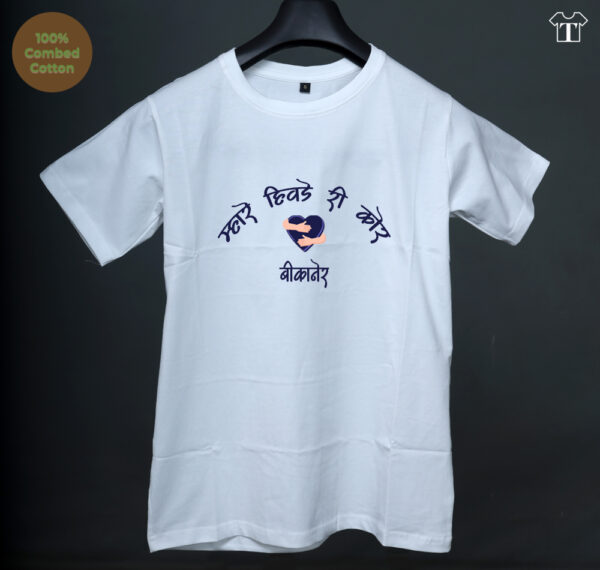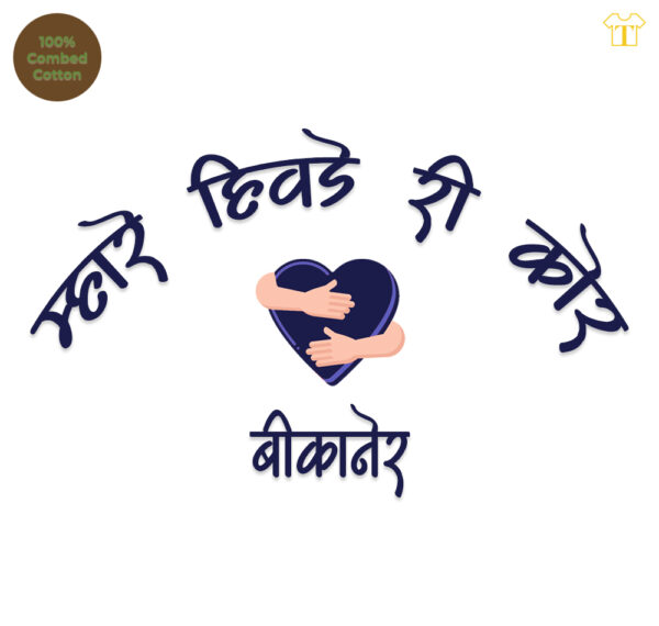 Tkashi Rajasthan Bikaner Love Printed Half Sleeve T-Shirt Turn heads in this eye-catching Rajasthan Bikaner Love Printed Half Sleeve T-Shirt! This comfy cotton tee boldly displays “Mhare Hiwde Ri Kor Bikaner” and a sweet hug icon on the front, grabbing attention wherever you go.